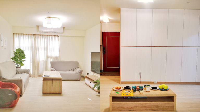 之前租屋我很清楚家裡客廳會擺什麼東西,就打算客廳不要有過多裝飾,越多裝飾代表你要花更多時間整理,空間只要簡單收納就會覺得舒服,像之前會在客廳常擺的冬天外出衣、吸塵器、蒸氣拖把、各類雜物、書,都放計畫收納櫃裡。