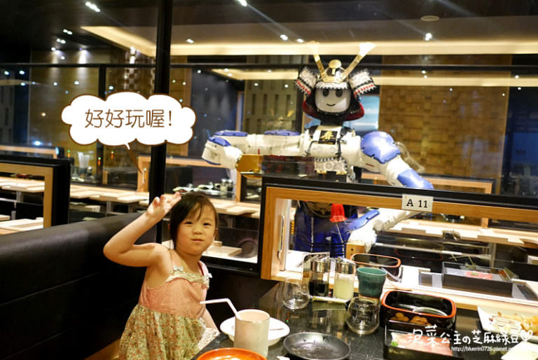 座位就是這樣,兩排沙發椅,各有2台機器人負責,因此座位不多,但我也不知道這裡平常生意好不好?當天晚餐只有我們家一桌、另一桌外國遊客、另外一桌就是照片上泰國爸爸帶小孩來吃,共三桌而已。